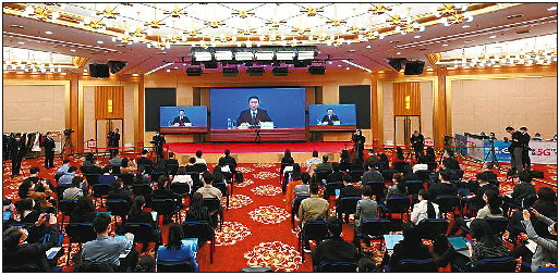 ◥大会新闻发言人郭卫民通过视频回答记者提问。