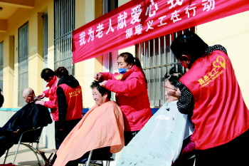 雷锋日临近,昌邑义工的志愿者们发起为老人理发的活动。