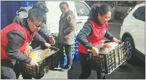 董方(右)和宋凯在搬运社区团购的货物。