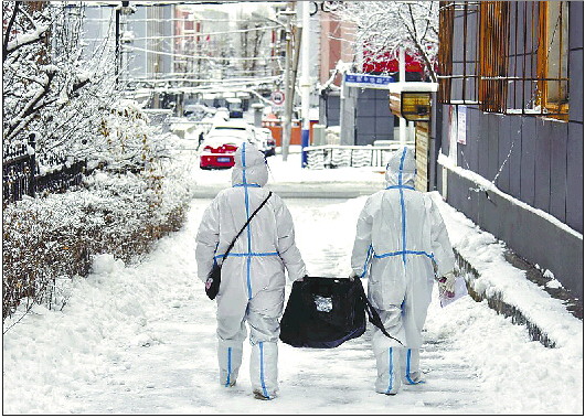3月16日,长春市朝阳区永昌街道社区工作人员挨门挨户发送“新冠病毒抗原自检测试剂盒”。 新华社发