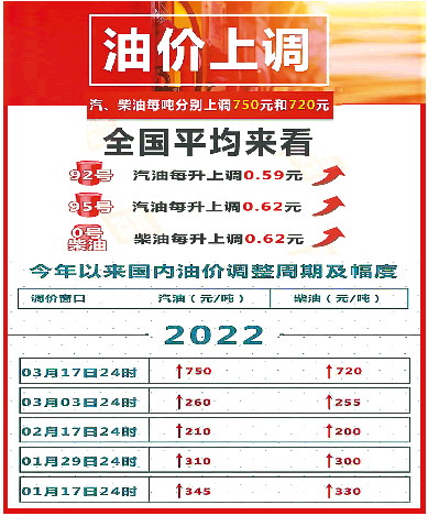 3月17日24:00将迎来汽柴油全面调价,这也是2022年内首次“五连涨”,每吨汽油上调750元、柴油上调720元,折合汽油每升89#上涨0.55元、92#上涨0.59元、95#上涨0.62元,0#柴油每升上涨0.62元。