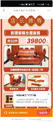 点开链接以后可以看到胡先生所说的“白菜价”红木家具包括沙发、电视柜、餐桌椅、金丝檀木大床等,类似的广告还出现在短视频平台上。