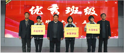 长清区实验中学校长孙广益(左三)给学生颁奖。