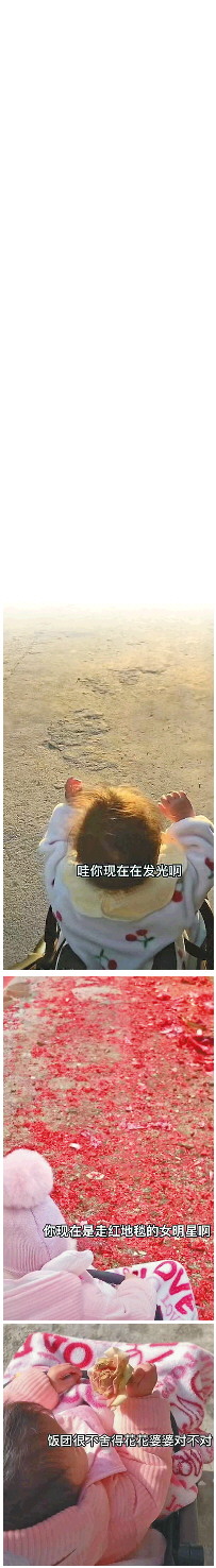 2022年2月6日,杜小敏带着“饭团”,看到路边石头上爬着一串叶子。她指给“饭团”说,“这里有一条项链啊。是春姑娘啊。”再往前走,杜小敏看到落了一地地鞭炮红色包装外壳,她推着婴儿车带“饭团”走过去,“哇,你现在是走红地毯的女明星啊。”