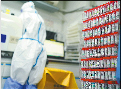 ◥3月23日凌晨,上海同济医院内的核酸检测实验室灯火通明。据了解,目前该实验室10台检测设备24小时不停机,日处理样本量超万管。 新华社发