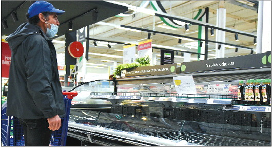 23日,一名男子站在西班牙卡塞雷斯一家超市内空荡荡的蔬菜沙拉货架前。 新华社发