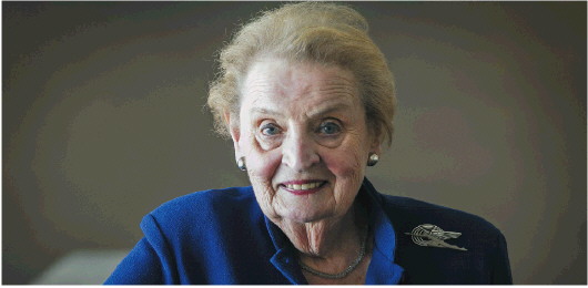 作为美国首位女国务卿,奥尔布赖特始终认为女性可以做任何她们想做的事。2016年希拉里竞选美国总统,她为希拉里拉票助威。其他民主党候选人也得到过她的支持,比如奥巴马。2012年,她被奥巴马授予“总统自由勋章”,这是美国公民所能得到的最高荣誉。