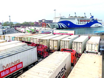 4月12日,发自大连港的“渤海玛珠”客滚船准时抵靠山东港口烟台港,首批78辆冷藏货车经烟台港“绿色通道”,在三个“第一时间”全力保障下,满载着辽鲁人民情谊的时鲜物资经沈海高速公路星夜驰援上海。此次辽宁驰援上海的时鲜物资总量约2300吨,分三批次发运。