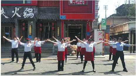 一家餐饮企业组织员工跳健身舞,为员工做心理疏导。