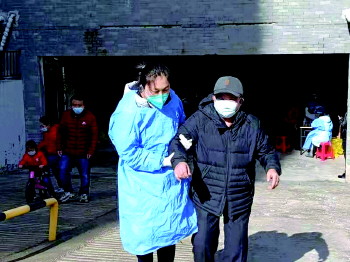 3月26日,在烟台市蓬莱区海韵苑核酸检测现场,社区网格员搀扶行动不便的居民做核酸检测。通讯员供图