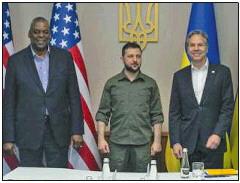 泽连斯基在基辅会见布林肯(右)和奥斯汀(左)。