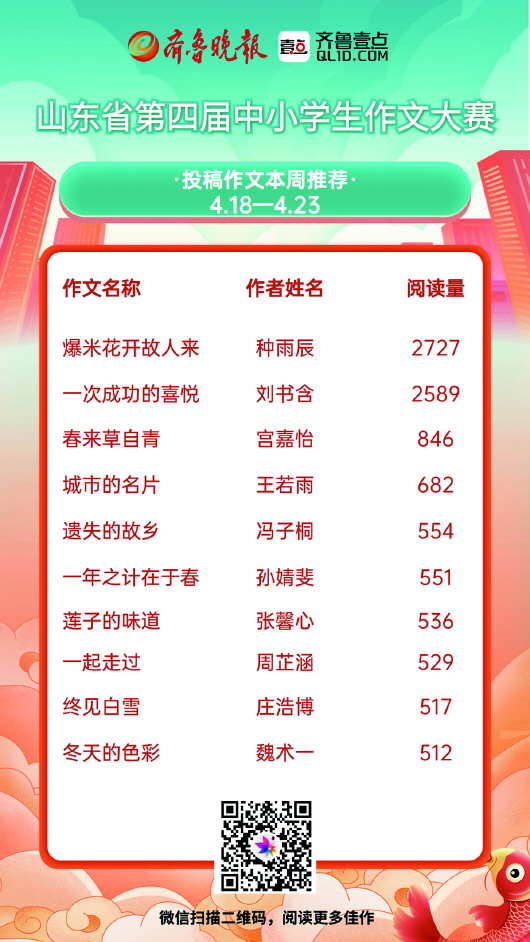 值得注意的是,本次作文大赛的征集令一经推出,便收到了来自全省中小学生的投稿作品。在第一周的作文投稿中,出现多篇精品作文。记者登录“齐鲁小作家壹起写”平台发现,赛事榜单中不少作文点击量近3000次,点赞量也近1000次。