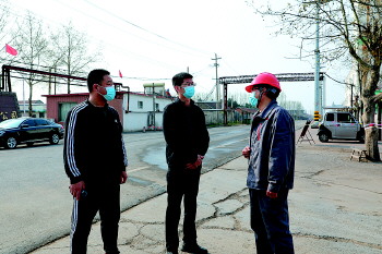 ◥高新街道党工委书记王建伟(左)到村督导疫情防控工作