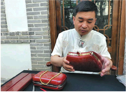 ◥张国华用红木嵌银髹漆技艺制作的手包。