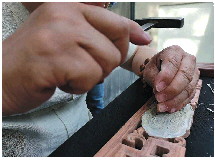 在制作红木嵌银漆器前,先要选择好木质细腻的红木,其次制作胚胎,就是将木料按照需要切割打好基础。然后将设计好的平面画稿图案贴在胚胎的红木上,运用几十种雕刻工具进行立体的雕刻,是画稿的再创造。雕刻师不但要富有想象的审美理念,还要有精湛的手工技艺,最后就到了镶嵌金银丝的环节了。
