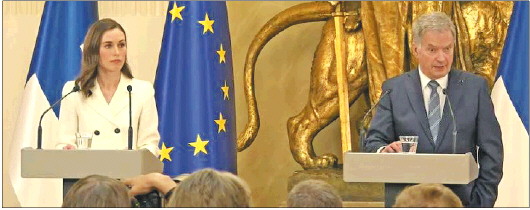 芬兰总统尼尼斯托(右)和总理马林15日宣布,芬兰政府正式决定向北约提出加入申请。