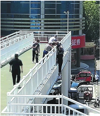 刘哲试探着叫了老人几声,发现老人精神恍惚,没有反应,三人没有再多耽搁,立马上去抓住老人的手。五月的夏日,老人的手出了汗,栏杆也比较滑,三位老师抓住老人时,中间还有一个隔挡,再加上老人本身的重量,多种因素都让他们感到在天桥上抓住老人越来越吃力,现场情况也越来越让人揪心。