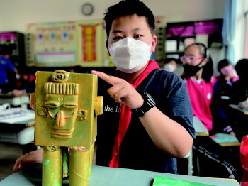 5月18日是国际博物馆日,今年的主题是“博物馆的力量”。当日,南山小学组织丰富多彩的活动,让孩子们感受“博物馆的力量”。图为学生用废旧物制作“青铜器”感悟文化的力量。