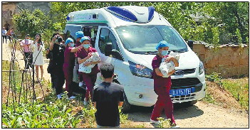 5月27日,医护人员护送五胞胎宝宝回家。