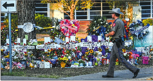 5月28日,在美国尤瓦尔迪市发生枪击事件的小学外,一名警官走过临时搭建的哀悼纪念场所。 新华/法新