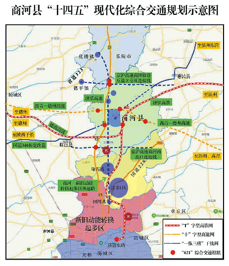 重大战略的交会叠加和交通设施的加快布局,为商河彻底打破交通瓶颈创造了新的历史性机遇,商河也紧紧抓住这一黄金机遇期和窗口期,主动承接“北起”使命,努力在跨越赶超中融入全市、全省大发展格局。依托已经建成的京沪高速、德龙烟铁路、商河通用机场,正在加速建设的商河-起步区快速路,以及即将开工的济滨高铁、德商高铁、高青至商河高速等重大过境交通项目,商河全力对标省市要求,科学谋篇布局,深度实施大手笔、大规划、大策划,聚心聚力打好交通强县攻坚战。进一步加快推进“T”字形高速铁路网、“十”字形高速公路网、“一”字形铁路货运专线、“四纵三横”交通干线网建设,以“6”个高速出入口、“2”个铁路站点、“1”个航空枢纽为中心的“621”交通服务枢纽将从蓝图变为现实。