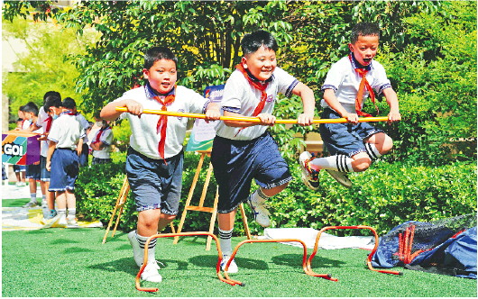 5月31日,在济南市槐荫区恒新小学,同学们参加“奋勇跨越向未来”游戏。 当日,为迎接六一国际儿童节,营造健康快乐的校园文化,济南市槐荫区教育部门开展以“文明游戏 快乐生活”为主题的红领巾游戏节,孩子们在互动游戏中积极协作,展现出阳光向上、朝气蓬勃的精神面貌。 新华社发