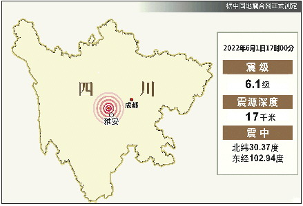 据中国地震台网正式测定,6月1日17时00分,四川雅安市芦山县发生6.1级地震,震源深度17公里。17时03分,雅安市宝兴县发生4.5级地震,震源深度18公里。