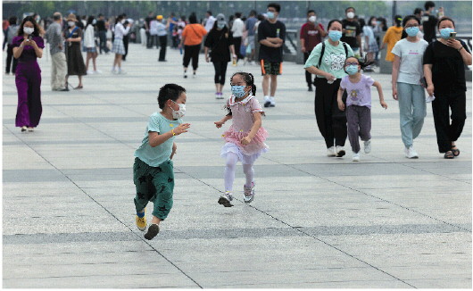 6月1日,孩子们在上海外滩观景平台玩耍。 新华社发