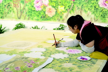 走进永丰书画院,空气中一丝墨香缓缓扑鼻,一幅幅清新淡雅的水墨牡丹画让人目不暇接。“色笔和水笔的作用不同,色笔上色,水笔润色,两支笔轮流交替,作出的画才更富有层次感。”绘画多年的常秀娟正指导画师们工笔画作画技巧。交谈间,只见两支画笔在她手中如行云流水般勾勒、延伸。很快,一朵风姿绰约的牡丹跃然纸上,栩栩如生。