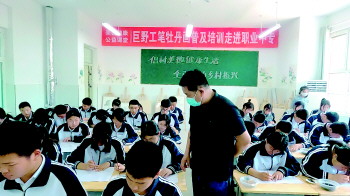 “毛笔尽量垂直,手腕可以放在桌子上,收笔不要太快。先上后下,先左后右,先勾主叶脉……”在巨野县职业中专课堂内,授课老师正在为学生们讲解工笔画知识,并手把手教他们用毛笔画工笔。