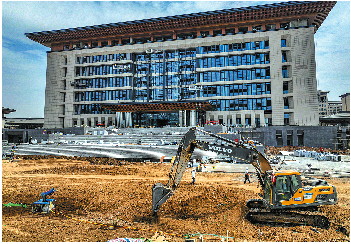 新校区最大的主体建筑多功能图书馆正在进行外墙装饰。 记者 康岩 摄