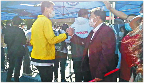 6月7日早上,王合江在青岛二中考点门口为考生加油。