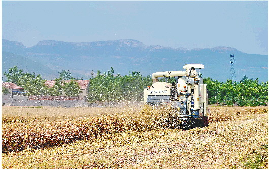 “金灿灿的麦田与周围的山村、远方的青山,还有忙收的机器和农民,构成一幅美丽的田园风景画,令人陶醉!”读者说。