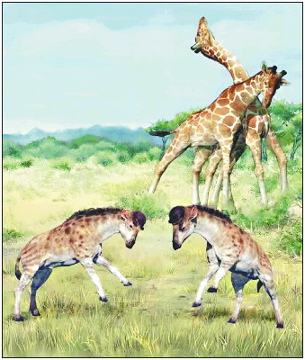长颈鹿类雄性斗争的对比,前景为獬豸盘角鹿,远景为长颈鹿。(复原图)