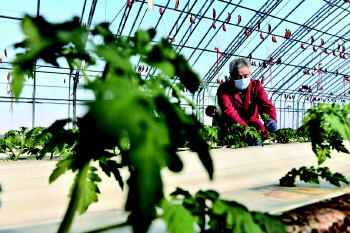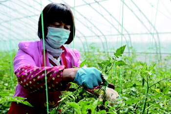 草莓西红柿大棚内,农户对果苗进行修整。
