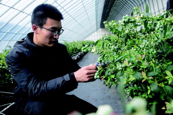 午极镇蓝莓产业党建的蓝莓大棚内,工作人员正在查看蓝莓长势。