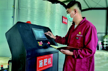工作人员通过施肥机调节水肥比例。
