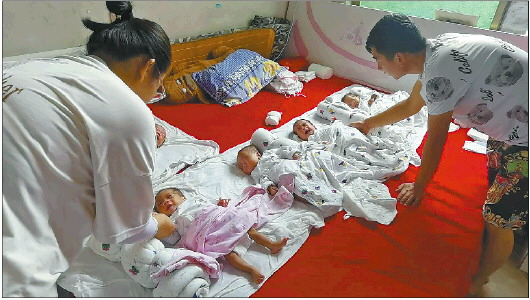 6月18日上午,彭振夫妇像往常一样为五个宝宝忙前忙后。夫妻二人相互配合,为宝宝们洗脸、洗衣服、换尿不湿……从早晨一直忙到中午,直到宝宝们睡着后,他们才有片刻休息时间。