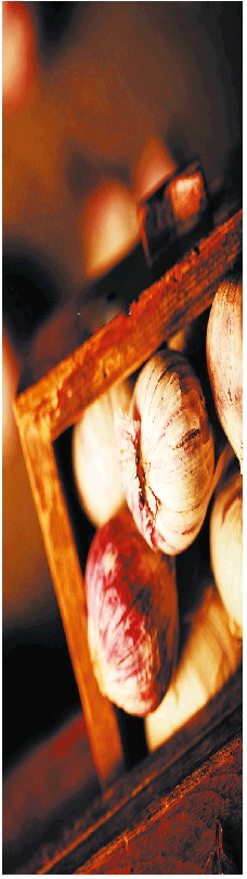 大蒜浑身是宝,成长中的每个时期皆可入食。青春年少时的蒜苗,蘸着黄豆大酱或用大饼卷着吃,一股的青春气息。五花猪肉爆炒蒜苗,也是一盘佳肴,伴之米饭,狼吞虎咽。中年盛期的蒜薹吃法更多,洗净了生吃,稍带一点辣头,清脆爽口。次之是用开水一焯,加盐以及轻点豆花酱油和米醋,拌过一刻钟入味即食,还可以存放三两天,味鲜不打折。当然做法最多的还是炒蒜薹之类,肉炒、鸡蛋炒,各种小海鲜炒,五花八门,样样好吃。记忆深处,鸡蛋熬蒜薹是我一直追寻着的味道。那是麦收的季节,天干燥热,烈日炎炎之下的劳作,争分夺秒,抢收抢种,不敢丝毫懈怠,中午饭常是各家做好了送到田间地头。正是蒜薹上好时,新鲜的鸡蛋、嫩翠的蒜薹,铁锅一熬,美味到无与伦比。接着收麦,一点不累。这是每年到季必做几次的一道美味。春末夏初鲜蒜上市,“一口鲜”将大蒜的正常生长期“咬”断了,为经济效益算计,也属聪明一招。我爱这口,尽管最初鲜蒜的价格一度达到极值,却丰富了大蒜的花样年华,拉长了鲜蒜食用周期。与鲜蒜对味的是小米面窝头,香气鲜美,每饭必吃。肥而不腻的熟猪头肉与大蒜同样很投脾气,隔三岔五解解馋。
