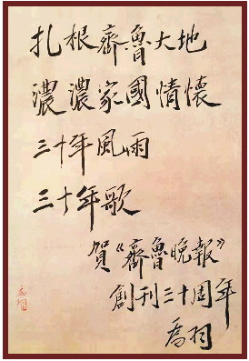 2017年9月,因为“齐鲁好家风”的相关策划,本报记者刘国胜赴京对乔羽先生进行当面采访。当时先生已经年近九旬,但依然思维敏捷,口齿清晰。其间他亲切地握着记者的手,回忆着自己的创作经历,不时地轻轻哼唱几句自己的作品,让人不自觉地沉入他对故乡深沉的热爱之中。后来,为了祝贺齐鲁晚报创刊三十周年,本报联系到乔羽先生,请他题词。此时因为年龄问题,乔羽先生已经基本不太参与此类的对外交流活动,但听说是家乡媒体邀约,他依然欣然命笔,为我们写下了“扎根齐鲁大地,浓浓家国情怀,三十年风雨,三十年歌”的题词。字里行间,充满了殷切的关心和祝福。