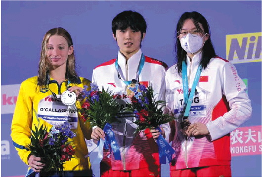 本届世锦赛,山东选手杨浚瑄(中)夺中国游泳队唯一金牌。 新华社发