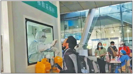 机场是城市的“空中门户”,守牢疫情防控的第一道关口,就能对旅客及全市人民的健康多一份保障。到达机场后,队员们严格按照疫情防控要求,迅速投入采样工作中。“头往后仰,张嘴,放松……”面对数以万计旅客的采样任务,医护人员个个身手敏捷,采样工作忙而不乱。看似简单的操作,医护人员却要在炎热的高温下“全副武装”进行,整个过程就像蒸包子,一举一动都能感觉到热气在防护服中涌动,汗水早已使衣物紧紧地贴在了身上,双手也早已被汗水浸得发白起皱。
