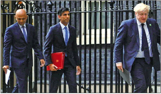 ◥英国首相约翰逊(右)、卫生大臣贾维德(左)和财政大臣苏纳克。