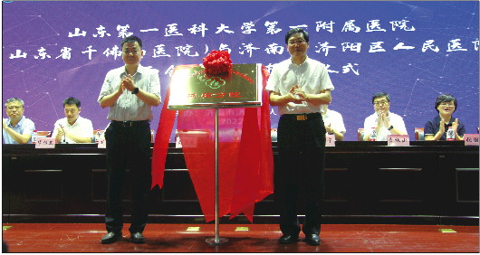 随后,千佛山医院党委委员、副院长王建宁与济阳区人民医院党委副书记、院长高峰签订各《专科联盟协议书》及《全面合作协议书》;区人民医院党委副书记、院长高峰分别与千佛山医院妇科主任荣风年、内镜科主任贾欣永、段瑞生神经内科主任、泌尿外一科主任刘庆勇为专科联盟揭牌;千佛山医院党委副书记、院长胡三元与济阳区区委副书记、区长黄晓广为两院全面合作揭牌。