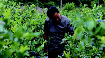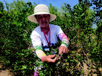 附近农户在蓝莓基地里打工,采摘蓝莓。