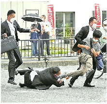 警察逮捕枪杀前首相安倍晋三的嫌疑人现场画面。