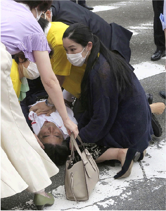 7月8日,日本前首相安倍晋三发表演讲时中枪,躺在街头。 新华/美联