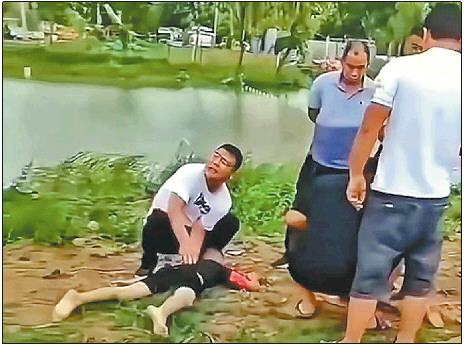 落水儿童被救上岸后,热心人士紧急施救。 视频截图