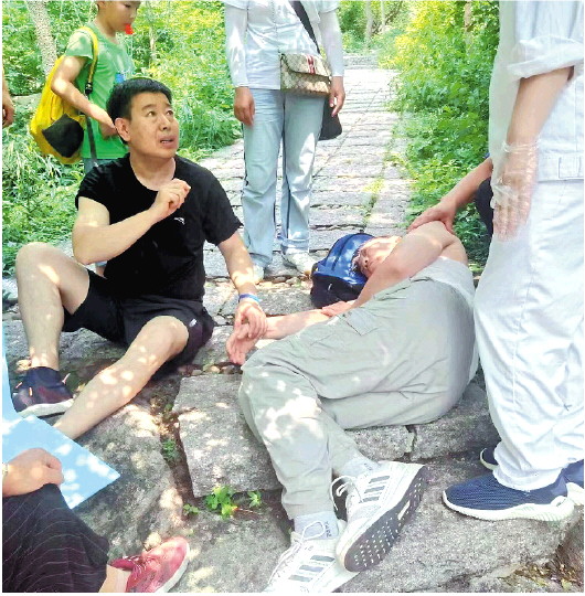 7月9日上午10时许,烟台海阳市招虎山顶,一名老人脸色蜡黄,随后意识丧失,四肢开始抽搐。幸运的是,海阳市人民医院的三名医生爬山路过此处,于是上前提供帮助,经过两次紧急施救,最终挽回了老人的生命。据介绍,老人此前有过类似症状,120急救人员到达现场后立即给他做了心电图,确认属于急性前间壁心梗。 见习记者 于洋 通讯员 孙小严 孙燕 摄影报道