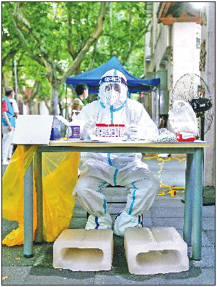 7月14日,在上海市徐汇区一处核酸采样点,核酸检测人员的脚下放置冰块用于降温。 新华社发